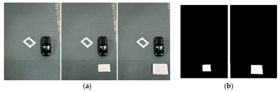 After calibrating the roadside unit end camera, the video captured by the camera is divided into image sequences, and the background model and the current image frame are selected (see Figure 12a). It includes two generalized obstacles of different sizes and heights. The presence area of the obstacle can be obtained through the background difference method, and the position coordinates of the obstacle can be obtained through coordinate transformation. The specific experimental results are shown in Figure 12.