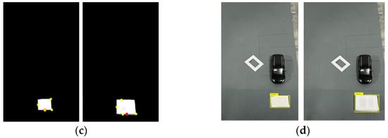 Obstacle extraction results based on the background difference method. (a) shows the before and after comparison of the initial background with the presence of obstacles; the first image is the experimentally selected background model , and the second and third images are the current image frames with no height pseudo-obstacle and with height generalized obstacle selected, respectively. (b) is the obstacle region obtained by the two different height obstacles through the comparison image, using the background difference method processing. (c) is the coordinate position of the obstacle and the coordinate positioning map of the obstacle position region. (d) shows the obstacle detection result map.