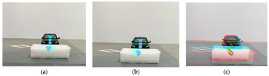 The scene shown in Figure 20 is taken as the test scene. Firstly, the initial background image and the current frame image are obtained by the RSU camera (see Figure 20a,b). The background difference image is obtained by the background subtraction method (see Figure 20c). According to the generalized obstacle coordinate position positioning method, the target generalized obstacle coordinate is (see Figure 20d). Due to the occlusion of the front vehicle, the vehicle-mounted unit camera cannot detect the target generalized obstacle (the diamond-shaped landmark is a pseudo-obstacle, and the obstacle of the occluded vehicle model can be deduced by the vehicle-side camera using the obstacle detection method based on VIDAR; the obstacle height is 1.69 m). The target generalized obstacle information can be detected by moving the vehicle (see Figure 20e,f). The obstacle detection method based on VIDAR is used to detect the target generalized obstacle, and the distance from the vehicle to the obstacle can be determined to be 3.6 m. According to Table 4 and Equation (10), the height of the obstacle can be deduced, and the height of the obstacle obtained can be determined by arithmetic average to be 0.1 m. According to the minimum height threshold of the vehicle chassis set by the RSU, the target obstacle is judged to be an unaffected obstacle, the information is transmitted to the vehicle equipment end (see Figure 19a), and the obstacle block diagram is eliminated (see Figure 19b).