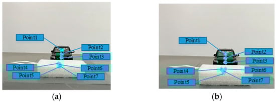In the vehicle-side obstacle detection, the camera pose is solved by P3P, and the horizontal distance of in the obstacle period of the two images is calculated by acceleration data. The acceleration and angular acceleration data of the vehicle-like mobile platform can be obtained by the inertial measurement unit. In the experiment, the fast image region matching method based on mean square error is used to process the images at time and time (see Figure 14). The centroids of the extracted seven matching regions are taken as feature points (see Figure 14a,b).