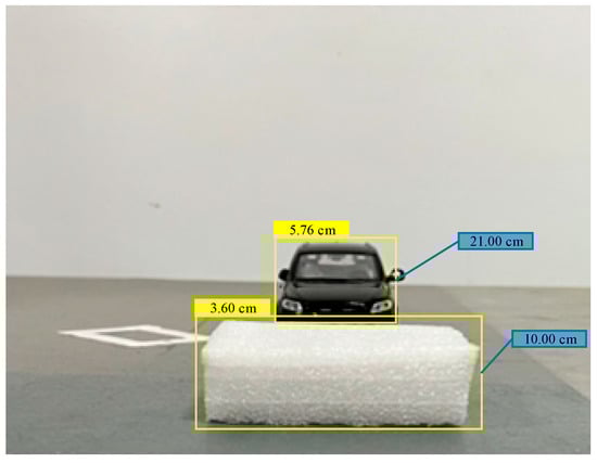 The calculation results show that the mean square error corresponding to the feature points is defined as the obstacle area, and the obstacle area is marked as the MSERs area. Feature points 1, 2, and 3 are feature points on the vehicle model, and the rest are feature points on the target generalized obstacle. The center point of the intersection line between the bottom boundary of the obstacle area and the road is taken as the ranging point of the obstacle, and the pinhole camera model is used to calculate the distance from the obstacle to the camera. According to Figure 16, the height of the target generalized obstacle detected in the experiment is 10.00 cm, the height of the vehicle model is 21.00 cm, the distance between the image acquisition unit and the target generalized obstacle is 3.60 cm, and the distance from the vehicle model is 5.76 cm. However, this method cannot solve the problem of the target obstacle detection out of view caused by object occlusion (see Figure 17).