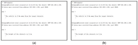 Diagram of information transmission results at both ends. (a) shows the data information received from MATLAB at the roadside unit device end to MATLAB at the vehicle device end for processing, which includes the obstacle height and the result data of the vehicle distance from the target obstacle, and (b) shows the data information received from MATLAB at the vehicle device end to MATLAB at the roadside unit device end, which includes the obstacle coordinate position and the obstacle discrimination information.