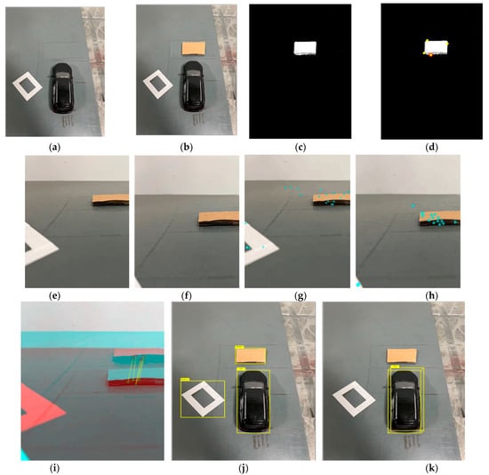 Test process of obstacle detection method based on roadside unit and vehicle mounted camera. (a) is the initial background image, (b) is the current frame image, (c) is the obstacle area obtained by the background difference method processing, (d) is the coordinate position of this obstacle obtained, (e) is the obstacle image at the moment , (f) is the obstacle image at the moment , (g) is the feature point extraction of the obstacle image at the moment , (h) is the feature point extraction of the obstacle image at the moment , and (i) is the global environment information at the camera end of the roadside unit and each marker label. (j) is the corrected global environment information after the obstacle detection method based on the roadside unit and the vehicle camera. (k) shows the area matching images before and after the two moments.