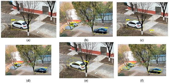 Comparison graph of obstacle detection results. (a,b) show the results of the VIDAR-based obstacle detection method. (c,d) show the results of the roadside-unit-based obstacle detection method. (e,f) show the result of obstacle recognition after processing the obstacle detection method based on the roadside unit and the vehicle-mounted camera.