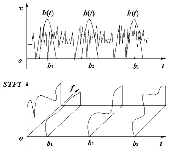 In Formula (4), represents the frequency, represents the starting time of the current window and represents the contribution of the signal component with frequency in the window at time . is the period of time, is the unsteady signal and is the window function. The schematic diagram of STFT is shown in Figure 1.
