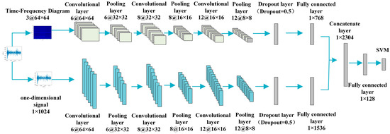 The overall workflow of the 1DCNN + 2DCNN + SVM model is shown in Figure 2. The upper channel 2DCNN and the lower channel 1DCNN work simultaneously. The feature vectors extracted via the two channels are then combined into one fused feature vector. Finally, SVM is used to identify and classify the fault types. The multidomain information fusion CNN structure parameters are shown in Table 1.