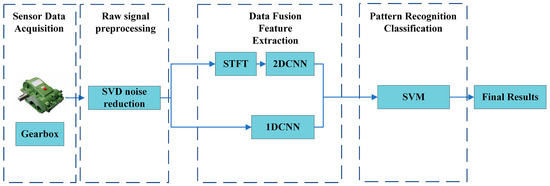 As shown in Figure 3, the first part is sensor data acquisition. The acceleration sensor acquires the vibration signals of the four gearbox states: pitting, broken teeth, wear and normal. The second part is the preprocessing of the original gearbox vibration signal. In this study, SVD is used for noise reduction processing. The third part is feature extraction. The noise-reduced vibration signal is subjected to dual-channel CNN simultaneous feature extraction. The upper channel performs STFT transformation on the signal data to obtain a two-dimensional spectrum image, and then places the two-dimensional spectrum image into the constructed 2DCNN network model. The lower channel places the data into the constructed 1DCNN network model. Finally, in pattern recognition and classification, SVM is used for classification to obtain the final fault diagnosis result.