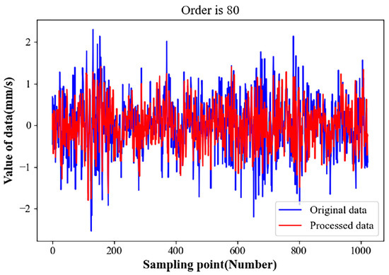 It can be seen from Figure 6 that the noise signal is located after the order of singular value 100, and that the singular value is relatively small and gentle. The useful signal is located before singular value order 100, whereas the singular value is larger. The peak signal in Figure 7 corresponds to the position where the singular value in Figure 6 changes abruptly. It can be seen that, when the singular value order is 80, the peak signal in Figure 7 becomes flat. According to the definition of the energy difference spectrum, this indicates the boundary point between the useful signal and the noise signal. Therefore, the reconstruction order was taken to be 80; that is to say, the first 80 singular values were taken for signal reconstruction, and the later singular values were taken as zero. The signal comparison before and after noise reduction is shown in Figure 8. It can be seen that, after the noise reduction processing of the singular value energy difference spectrum, the signal mutation partly becomes smooth. The overall periodicity of the signal is more obvious, and the noise signal is basically well suppressed. This shows that it is feasible to determine the order of the reconstructed signal based on the singular value energy difference spectrum.