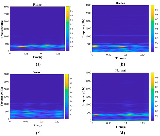 Time–frequency diagram of gearbox in different states: (a) pitting; (b) broken; (c) wear; and (d) normal.
