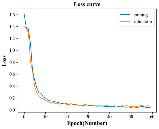 From the loss value change curves of the training and verification sets in Figure 10, it can be seen that the loss value of the training sample and the verification sample decreased continuously with the increase in epoch until finally tending to be relatively stable. In the first 10 iterations, the loss values of the training and verification samples dropped very rapidly, and the rates of decline of the two basic curves continued to change synchronously. The loss value dropped from around 1.6 to around 0.2, which showed that the model was converging rapidly. Within 10 to 30 iterations, the rate of descent of the training and validation samples slowed down significantly compared to the first 10 iterations. The loss value dropped from about 0.2 to about 0.1, which indicated that the model was still learning and had a tendency to converge. After 30 iterations, the loss values of the training and verification samples gradually approached 0. The two curves also basically overlapped, and there was no further change in the loss value. This indicated that the model had completed training and had good convergence.