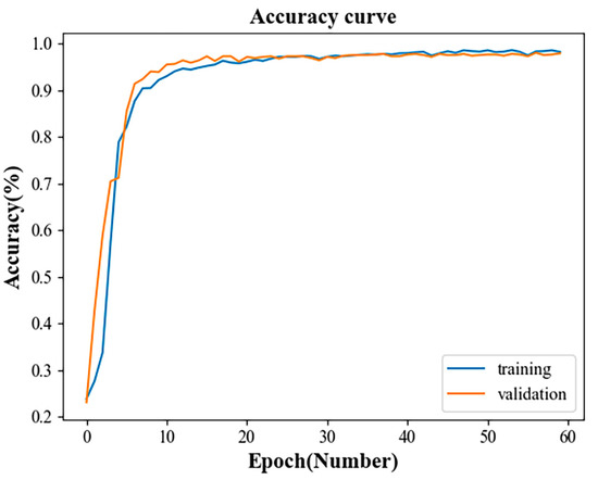 From the change curve of the accuracy rate of the training and verification sets shown in Figure 11, it can be seen that, within the first 10 iterations, the accuracy of the training sample and the verification sample rose rapidly and fluctuated significantly, rising from about 20% to about 88%. Between 10 and 30 iterations, the accuracy of the training and validation samples increased relatively steadily and slowly, with the accuracy rate increasing from about 88% to about 97%. After 30 iterations, the accuracies of the training and the verification samples were infinitely close to each other and basically remained unchanged. The overall curve was relatively smooth, and there was no large fold line fluctuation. This indicated that the network model had been trained and also proved that the multidomain information fusion CNN network model had fast convergence and high accuracy of fault diagnosis and classification.