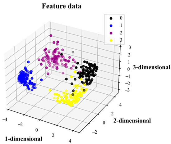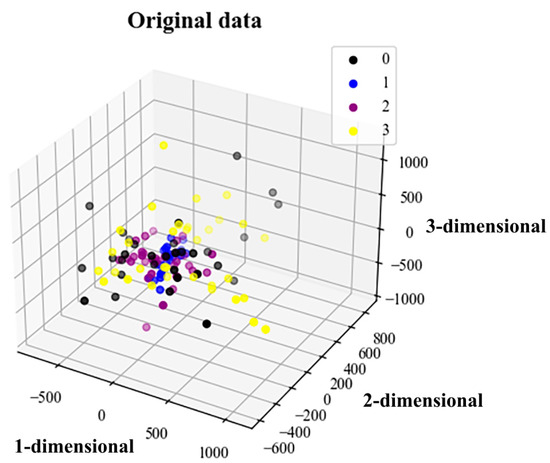 t-SNE (t-distributed stochastic neighbor embedding) is a dimensionality reduction technique. It is applied to represent high-dimensional data in a two-dimensional or three-dimensional low-dimensional space and can be used for the visualization of high-dimensional data [45]. This technique was used to visualize the features extracted by the model. Figure 12 and Figure 13 show the original and characteristic data, respectively.