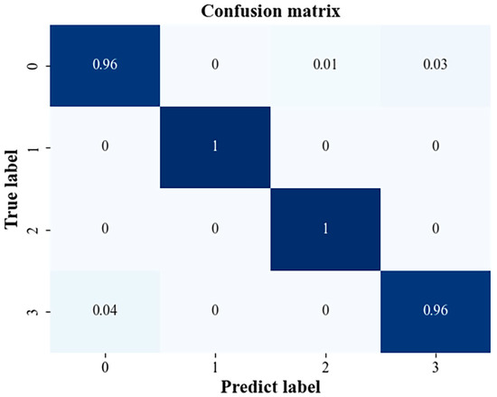 From the sample test results shown in Figure 14, it can be seen that the recognition rate of label 1 (broken gear tooth) and label 2 (gear wear) reached 100% in this recognition process. It shows that the two states of gear broken tooth and gear wear can be identified very accurately. For label 0 (gear pitting) and label 3 (gear normal), the recognition rate was relatively low, reaching 96%. For label 0 (gear pitting) and label 3 (gear normal), the recognition rate was relatively low, reaching 96%. Some 1% of gear pitting conditions were mistaken for worn gear conditions and 3% for normal conditions, while a reading of 4% of the normal state of the gear was mistaken for the pitting state of the gear. Overall, the recognition accuracy of this model is high, which confirms its feasibility for gearbox fault diagnosis.