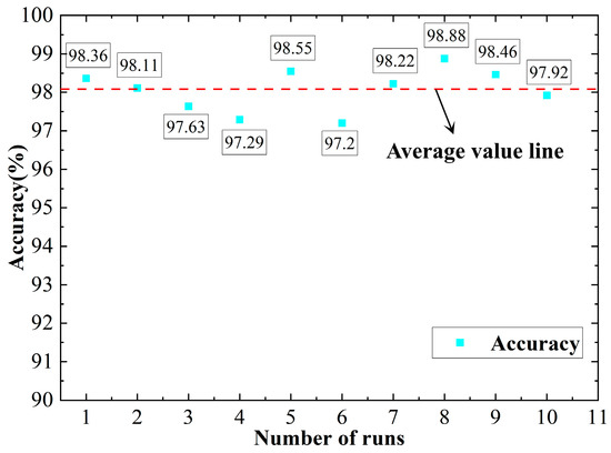 Figure 15 presents the recognition accuracy results from 10 runs of the multidomain information fusion CNN network model. Of these, the fifth run had the highest accuracy, reaching 98.88%. The sixth run had the lowest recognition rate at 97.20%. The results from the 10 runs basically fluctuated around 98.08%. The average accuracy rate was 98.08%. The overall fluctuation was not large, and the stability was good.