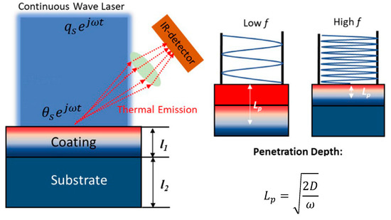 The penetration (radially and axially) of this wave is usually defined as the depth where the wave has reduced by 90% and is often approximated by , where D is the thermal diffusivity [27]. The penetration depth is visualized in Figure 1. On the left, a laser with modulated intensity is incident on a two-layer sample. The thermal emission is captured using an infrared detector. On the right, the relationship between the modulation frequency and penetration depth is illustrated, showing that a lower frequency results in deeper sample penetration. Equations (7) and (8) can be simplified by relating temperature and heat flux at z = d to those at z = 0 for a single homogenous layer [30,31,32], which results in the following relationship: