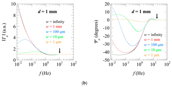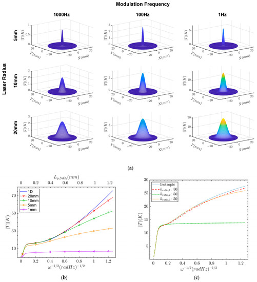 The spatial dependence of the temperature response is shown in Figure 3a for various modulation frequencies and laser radii. The laser intensity was held constant at to allow direct comparison between cases. As the modulation frequency increased, the radial and axial penetration into the sample increased, with a notable rise in the spatial temperature amplitude. At 1 Hz, we observed 0.4 mm of penetration into the silicon layer. In Figure 3b, the 1D (Equation (21)) and 2D (Equation (18)) temperature responses at are shown for various laser radii as a function of the inverse root modulation frequency and penetration depth. As the penetration increased, the heat was radially dampened, causing the response to saturate and thus deviate from the 1D response. Subsequently, as the laser radius increased from 5 mm to 20 mm, the radial heat uniformity increased, causing the 2D and 1D response to be consistent over a larger penetration range. While the sample was assumed to be isotropic, the effect of anisotropy can be studied by modifying the thermal conductivity ratio introduced in Equation (6).