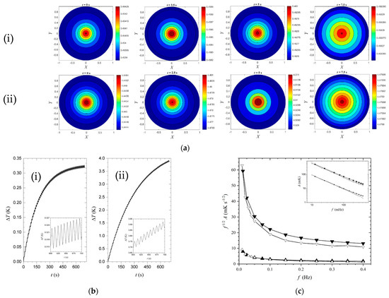 Hernandez-Wong et al. [39] computationally presented the transient solution of Equation (24) using FEM analysis, as seen in Figure 4. In Figure 4a, we observe the transient spatial temperature distribution on the aluminum (Figure 4a(i)) and copper (Figure 4a(ii)) disks, respectively, both with a 1 mm thickness and 1 cm radius. The heat flux was modulated using a square profile at a constant frequency of 0.12 Hz, resulting in 1.60 and 1.76 cm of sample penetration, respectively. As the time increased, the temperature increased radially at differing rates due to differences in penetration. The transient temperature at the center can be seen in Figure 4b; it contains a large DC term (largely ignored in the above analysis) and a small AC term whose amplitude and phase can be predicted by Equation (26). The differing thermal properties between aluminum and copper result in different DC and AC behavior. In Figure 4c, the frequency response is shown for both the analytical (full-triangle) and the FEM (empty-triangle) results. The analytical results were formulated using a similar theory to that in Section 2, while the numerical solutions were produced with COMSOL. A discrepancy between these results arises due to the AC component approaching the value of the DC component, resulting in the nonlinear nature of blackbody radiation affecting the accuracy of the analytical model.