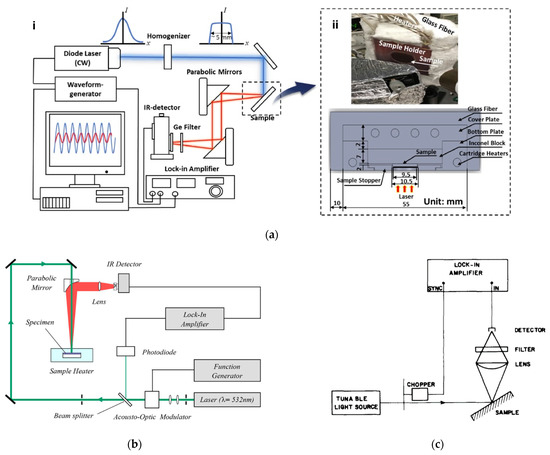 Various examples of MPTR experimental setups: (a) setup using direct sinusoidal modulation of a 445 nm CW diode laser (i) and internally heated sample holder (ii) [33]; (b) AOM externally modulated 532 nm CW laser producing a square profile with an externally heated sample [40]; and (c) optomechanical chopper modulation with lens optics [13]. Reproduced with permission.