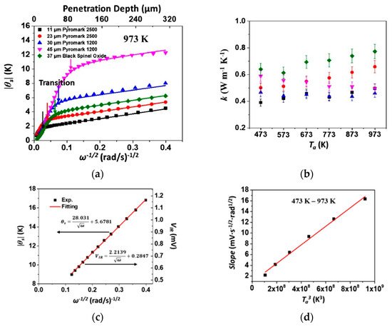 As mentioned in Section 2, the complex temperature response is described by its magnitude and phase, which are captured in the photodetector voltage described by Equation (30). The lock-in techniques described in Section 4.3 directly measure the magnitude and phase of this signal. Analyzing this signal and the expected response allows the thermophysical properties to be measured. Phase analysis requires minimal system calibration, while magnitude analysis requires the estimation of the calibration of constant E in Equation (31). The previous techniques focused on phase measurements to avoid the calibration; however, new work has changed this focus. Initial efforts to avoid magnitude calibration employed the parametric sweeping of variables such as thickness [64]. A recent technique used nonlinear effects and heterodyning to overcome the calibration issues often found in MPTR. While heterodyning has been used in lock-in thermography [65], Chirtoc [53] extended the concept to MPTR. In this method, two lasers (of different wavelengths to avoid interference) are superimposed at the sample surface; this can be used to cancel out calibration constants in the MPTR signal. While this approach is interesting, it is difficult to apply, requiring two laser sources (each with its own modulation source) and lock-in amplifiers. Zeng et al. [33] provided two solutions: the omission of the calibration constants by ratio measurement to a known reference (often used in pyrometry [66]), and direct calibration using a separate pyrometer. Figure 6a shows their calibrated temperature response for a two-layer sample consisting of coated 304 stainless steel disks (4.25 mm radius). Three different solar-absorbing coatings were studied. The coating thickness ranged from 11 to 45 µm, while the steel substrate was 1 mm thick. We see two distinct linear regions form; these are associated with the coating and bulk as the modulation frequency decreases. By using the linearized relationships shown in Figure 6c, the slopes of these regions were used to produce coating thermal conductivity measurements across a wide temperature range, as shown in Figure 6b. While the solutions proposed by Zeng et al. are attractive, they have their drawbacks. Their ratio measurement depends on the validity of 1D heat transfer [33], thus limiting the experimental scope and applicability by requiring the laser radius to be much larger than the radial penetration. Pyrometer-based calibration suffers from inaccuracies due to limited bandwidth from low response times (>1 ms) and requires well-known sample emissivity.