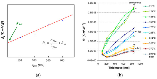 (a) Thermal resistance of film compared to film thickness; (b) thermal resistance versus film thickness at various temperatures showing phase dependence on thermal properties of GeTe films [40]. Reproduced with permission.