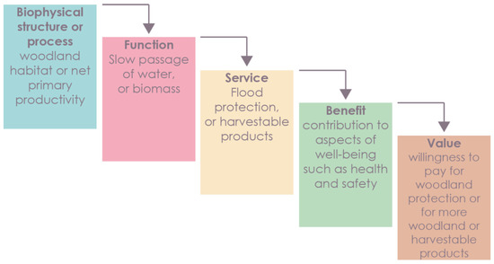 The classification of ecosystem functions and services has been addressed by several authors [14,15,16,17]. De Groot identified a total of twenty-three ecosystem functions, which were divided into four basic categories: regulation, habitat, production, and information [15]. The issue of the division of ecosystem functions and services has become more widely known thanks to the Millennium Ecosystem Assessment [7]. A similar classification was developed by the TEEB [10]; however, it was primarily concerned with ecosystem services from an economic perspective. Another important development in the field of ecosystem-service classification was the creation of the CICES (Common International Classification of Ecosystem Services) database. Version 4.3 of the database was released in 2013 and replaced by version 5.1 in 2018. The database is divided into three main categories: provisioning, regulating, and cultural. These categories are subdivided further according to biotic and abiotic ecosystems. However, the exact delineation between the classification of ecosystem functions and services is vague. This vagueness lies in the fact that some ecosystem services are classified as classes of ecosystem functions and vice versa. Many authors have failed to accurately delineate the boundary between the classifications of functions and services [6,17,18]. The interdependence between ecosystem functions and human well-being is shown in the ecosystem cascade [19]. In this context, biophysical processes and ecosystem functions are considered as supporting and intermediate services and ecosystem services as final services. Final services are those that can be harvested or gained from the ecosystem. Because the concepts already overlap, we do not refer to processes and functions as supporting and intermediate services. Ecosystem function appears in the second stage of the cascade (Figure 2) and determines the functions of biophysical processes and structures. The result of the whole cascade is the value that every service represents for human well-being.