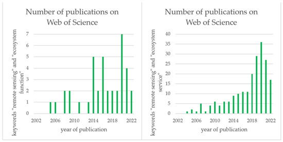 Published articles on Web of Science using the keywords “remote sensing” and “ecosystem function” (left) and using the keywords “remote sensing” and “ecosystem service” (right).