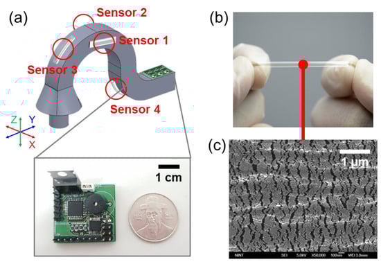 In recent years, research on wearable devices has attracted significant interest, with the direct measurement employing stretchable or flexible strain sensors [29]. Although this method is constrained by its capacity to measure only specific aspects of movement where the sensor is attached, it surpasses other techniques in terms of sensitivity, and possesses the ability to measure various strains irrespective of location and direction, depending on the purpose [30,31,32,33,34,35]. Moreover, accurate measurement of diverse deformations, ranging from small (skin-level motions like pulsation) to large (joint-level motions) magnitudes, can be achieved with the appropriate sensor. The flexibility and diverse shapes and sizes of strain sensors also permit their attachment to the surface of non-flat, dynamic objects or an array of objects to measure the object’s deformation. Thus, 3D motion sensing can be conducted more effectively by using stretchable strain sensors customized for different structures and applications.