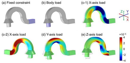 The flexible body’s geometry was designed using 3D CAD software (SolidWorks 2018) and subsequently imported into the numerical simulation software. The Solid Mechanics module was utilized in the numerical analysis, with two key boundary conditions applied: a “Fixed constraint” condition to designate one end of the flexible body as fixed, and a “Body load” condition to apply external motion (or load) to the knob of the flexible body, as depicted in Figure 2a,b. The optimized sensor position should satisfy two requirements: high deformation and minimal interference between sensors. As the sensors are attached to the flexible body in the longitudinal direction, which corresponds to the Y-axis in Figure 2, we analyzed the magnitudes of Y-axis normal strain (εyy) under X-, Y-, and Z-axis body load conditions (at 0.01 N), respectively. Figure 2c–e illustrate the magnitudes of Y-axis normal strain (εyy) under X-, Y-, and Z-axis body load conditions, respectively. Although it is not feasible to identify specific regions affected exclusively by one axial load independent of other axial loads, we were able to select regions predominantly influenced by each axial load with high deformation. The optimized sensor positions were determined primarily based on numerical analysis results with sensor attachment compatibility. In order to measure both stretching and shrinking modes at specific regions using an OPSS sensor, it is necessary to apply pre-strain to the sensor when affixing it to the flexible body’s surface. Consequently, a convex-shaped surface is more compatible for sensor attachment. The determined optimized sensor positions are represented in Figure 1a, where sensors 1 and 2 are primarily responsible for the X-axis motion (or load) of the knob of the flexible body, while sensors 3 and 4 predominantly account for the Y- and Z-axis motion (or load), respectively.