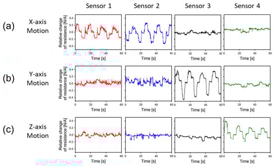 Resistance change of each sensor measured when moved in (a) X-, (b) Y-, and (c) Z-axes.