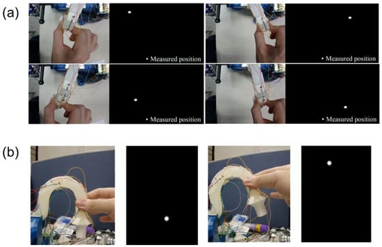 The independent changes in resistance data for each axis when the 3D controller is moved imply that not only simple movements of the X-, Y-, and Z-axes but also complex movements can be accurately displayed. Furthermore, if these resistance data are collected in real time and simultaneously, the movement of the 3D controller can be traced back with only the resistance data. In this regard, Figure 4 shows the result of visualizing the movement of the 3D controller based on the measurements of four OPSS sensors attached to the optimized locations of the controller. Four OPSS sensors were attached to the deformation part of each axis of the 3D controller, and the resistance change of each axis was measured in real time through the MCU-based real-time multi-resistance measuring system. First, after attaching sensors to the deformation parts of the X- and Y-axes, the results of predicting the position of the knob through the resistance data change when the 3D controller knob is moved in the order of upper left, upper right, lower left, and lower right on the XY plane are presented in Figure 4a. At this time, it was confirmed that the movement of the knob was accurately measured because the movement of each axis did not affect each other’s resistance data even in the complex movement in which the X and Y components were mixed. Therefore, the predicted position matched the actual position accurately. Similarly, the position of the knob can be predicted by collecting the change in resistance when the knob is moved in the Z-axis direction, as shown in Figure 4b. In addition, the sensor was attached to the Z-axis deformed parts and the movement of the knob was successfully sensed and visualized. When the 3D controller moves, the position can be expressed as X, Y, and Z components by the Cartesian coordinate system, and the final position is determined by the sum of each movement. Likewise, the sum of the corresponding resistance changes on each axis can accurately track the position of the 3D controller.