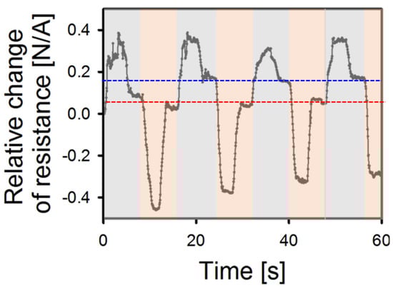 Resistance change of sensor and two rest resistance in front and back motion; the blue and red dotted lines represent the tension and contraction phases, respectively.