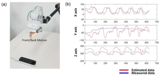 Position comparison using sensor recognition system and position prediction using sensor. (a) Motion recognition by Leap Motion when 3D controller has front and back motion (b) Comparison of front-back motion predicted through machine learning and sensors and Leap Motion position tracking.