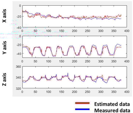 Figure 6b is the result of comparing the position data of the 3D controller obtained through the Leap Motion with the position data derived only with resistance change through the learning algorithm. As a result, inaccurate or non-measurable results were obtained. In the graph, the red line is the position data value measured by the Leap Motion, and the blue line is the position data value derived through the learning algorithm when there is a change in resistance. Although the position is matched for the X-axis, the position data value is not derived at all for the remaining Y-axis, and in the case of Z, the movement is smaller than the actual movement. It can be confirmed that the position data cannot be tracked with only a sufficient resistance. This is the crosslinking problem of polymer materials mentioned above, and it that occurs because the resistance value continues to change even at the same location. Even when the resistance pointing to the position 0 is set through the learning algorithm, the same position shows different resistance according to the tension and contraction of the 3D controller, which becomes an obstacle in tracking the movement of the 3D controller.