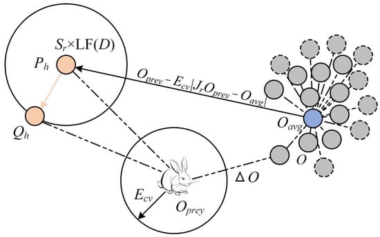 The HHO algorithm is a gradient-free algorithm proposed in 2019 []. It solves the optimisation problem by simulating biological behaviours such as tracking, encircling, repelling, and attacking in the process of collaborative prey hunting by Harris hawk groups in nature, where each member of the Harris hawk population represents a candidate solution. The HHO algorithm consists of three phases: exploration, transition, and exploitation. When |Ecv| ≥ 1, the Harris hawk algorithm performs a global exploration. In this stage, Harris hawks are randomly perched in a location, searching and tracking their prey through keen vision. The hawks select one of the two strategies with equal probabilities to determine the perching locations. When |Ecv| < 1, the algorithm entered the exploitation phase, several Harris hawks swept up at the same time to form an encirclement and waited for the time of surprise attack. The HHO algorithm selects a suitable location update strategy based on two parameters: prey escape energy, Ecv, and successful escape probability, c. Figure 2 is a simple example of the process through which a Harris hawk chases its prey. The whole search process of the algorithm is as follows: