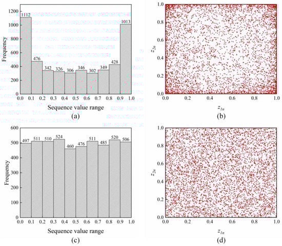 A reasonable initial solution for the population can increase the search space and accelerate the convergence of the population. Chaos [], as a nonlinear phenomenon in nature, has been widely used in swarm intelligence optimisation algorithms because of its ergodicity, randomness, and sensitivity to initial conditions. Presently, logistic chaotic maps are widely used in metaheuristic algorithms. Previous studies emphasise that PWLCM systems have unique advantages compared with logistic maps [,]. Figure 3a–d show the histograms and point distribution diagrams of the logistic map and PWLCM system, respectively.