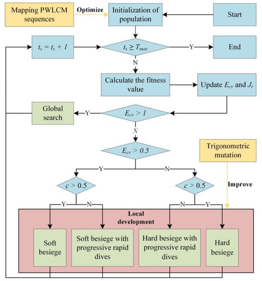 The centre point of the hypergeometric triangle search space is used as the base vector position, and the individual mutation direction and step size are controlled by the weighted vector. When , the base vector moves towards individual Zm. When , the base vector moves towards individual Zn, ensuring that the candidate solution updates its position in the direction of the better individual at each iteration. As shown in Figure 4, when , the individual moves in direction Zt3,n, which has the smallest objective function value. Furthermore, the Gaussian distribution factor, orm,n, regulates the degree of trigonometric mutation perturbation. Figure 5 shows the flowchart of the TMCHHO algorithm.
