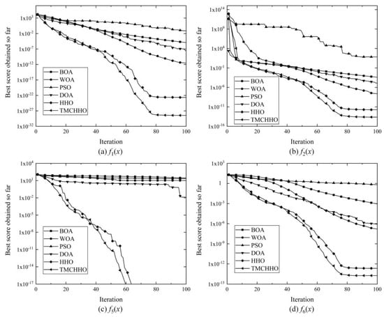 In order to verify the superiority of the TMCHHO algorithm, seven representative benchmark functions were selected to carry out optimisation experiments, as shown in Table 1, where fmin denotes the optimal value at which the benchmark function can converge theoretically, and range is the constraint on the candidate solution. The functions [f1(x) − f4(x)] are single-peaked benchmark functions with only one local extreme value, which are suitable for testing the global exploration ability. The functions [f5(x) − f7(x)] are complex multi-peaked benchmark functions with multiple local extreme values, which are suitable for testing the ability to jump out of premature convergence.