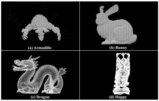 Standard point cloud datasets: (a) Armadillo; (b) Bunny; (c) Dragon; (d) Happy.