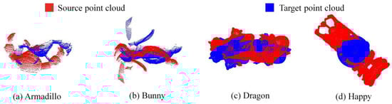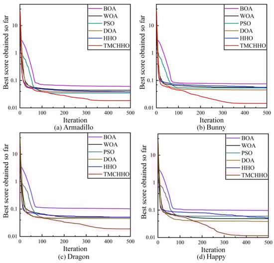 To verify the feasibility of the TMCHHO algorithm in the field of point cloud registration, experiments were conducted using the data obtained from the Armadillo, Bunny, Dragon, and Happy datasets, and they were compared with the data from other algorithms. Figure 7 shows the standard point cloud set used in this paper. Following the single-variable principle of comparative experiments, the same population size, iteration times, and initial value range were set for each swarm intelligence optimisation algorithm. In the experiments presented in this section, the number of iterations, population size, and initial value range were set as 500, 30, and [−50, 50], respectively. All algorithms were programmed in MATLAB R2016b, and an Intel Core i7-9750H 32 G computer was used.