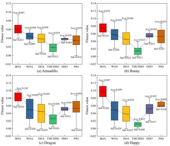 To analyse the performance of the TMCHHO algorithm further, Table 4 outlines the experimental results of each algorithm on different datasets. It can be seen from the table that the performance of the TMCHHO algorithm on the two data indicators of the average and worst values was the best among the six algorithms, and its stability performance was second only to the traditional HHO algorithm and better than the WOA, BOA, DOA, and PSO algorithms. Compared with the traditional HHO algorithm, the registration accuracy on the Armadillo, Bunny, Dragon, and Happy datasets improved by 52.11%, 72.91%, 48.51%, and 77.69%, respectively. Figure 9 shows a boxplot that intuitively reflects the distribution and average level of each algorithm. The TMCHHO algorithm achieved satisfactory results for the coordinate matching problem on the above four standard point cloud datasets. Other comparative analysis algorithms were prone to falling into local loops or having inadequate stability, resulting in unsatisfactory final convergence results. The above statistical data demonstrate the feasibility and superiority of the TMCHHO application in the field of point cloud registration.