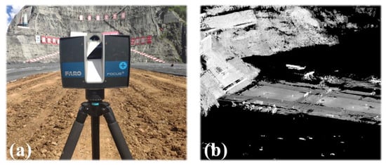 The equipment used for point cloud data acquisition was a Faro FocusS 350 terrestrial 3D laser scanner. During the field acquisition, we surveyed the measurement area in advance, adjusted the station location according to the actual scanning situation, ensured an overlap rate of at least 30% among adjacent stations, and set the scanning range to 360° × 300°. A total of 22 stations were deployed for this scan. Figure 12a shows the acquisition device, and Figure 12b shows the acquired point cloud data.