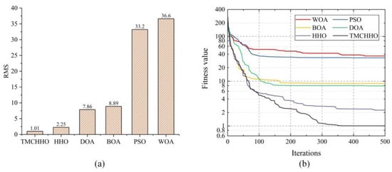 As shown in Figure 8, the iterative curves of each optimisation algorithm had a downward trend as the number of population update times increased. In contrast, the TMCHHO algorithm had a relatively large RMS value in the first iteration because of the more dispersed initial population; however, the reduction rate was rapid in the early stage. After more than 100 iterations, all the algorithms exhibited a stable trend; however, the convergence value of the TMCHHO algorithm was smaller after 500 iterations, proving the superiority of the algorithm.