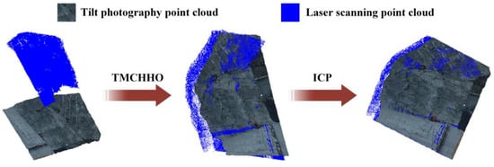 In the early 21st century, with the successful application of high-precision sensors, such as tilt photography cameras and LiDAR, to engineering construction, some scholars have conducted research on the fusion of cross-source data to achieve more realistic 3D model reconstruction. Escarcena et al. [] devised a high-precision method for modelling ancient sites based on both photogrammetry and terrestrial laser scanning techniques. Kedzierski et al. [] used different laser scanning systems to provide a database for high-precision urban model building. Nahon et al. [] designed a collaborative measurement model of 3D laser scanning and UAV aerial surveys for terrain mapping dune corridors.