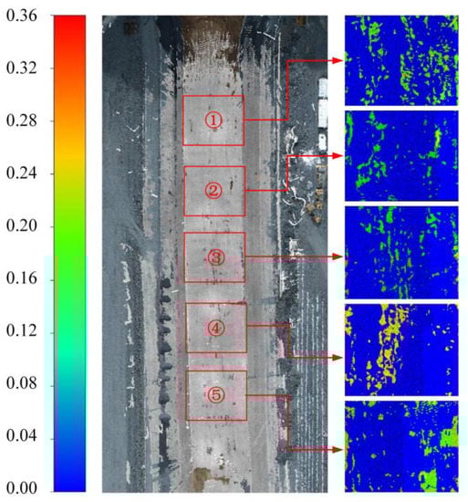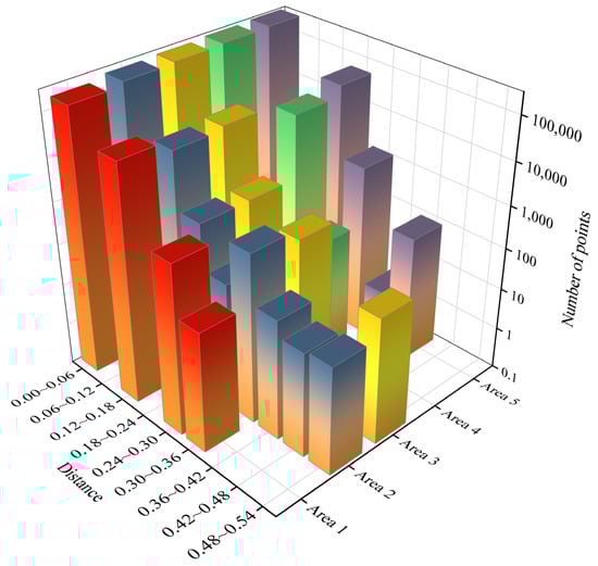 The conventional evaluation method is used to lay control points of the same name under multiple measurement techniques, use a total station to collect geodetic coordinates, and compare the absolute accuracy of model 3D reconstruction []. However, the coordinate acquisition of control points cannot be guaranteed due to the blind area phenomenon caused by the complex construction environment of the dam face and the special topographic conditions of the rockfill dam, so we performed a relative comparison of the dense point cloud models produced using the two measurement techniques. As shown in Figure 16, the dense point clouds produced using UAV tilt photography and 3D laser scanning were defined as the reference model and the target model, respectively, and a colour map with the Euclidean distance of the measured area was considered the index. The closer the colour was to red, the greater the deviation of the corresponding point cloud. To further evaluate the multimodal point cloud fusion, Table 7 lists the various indicators of Euclidean distances of the multimodal point cloud in the five measurement areas. Figure 17 shows the histogram of the Euclidean distance of the point cloud within the five measurement areas. Among them, the point cloud deviations were most distributed in the range of [0, 0.06], the average deviation range was 1.8–3.1 cm, and the degree of agreement between the two models was high. The intercepted point cloud data can be used to complement the missing parts. For example, the missing point cloud data of UAV tilt photography in the box shown in Figure 18a,c can be filled by a point cloud derived from 3D laser scanning. Figure 18b,d show the fusion point cloud model in different views.