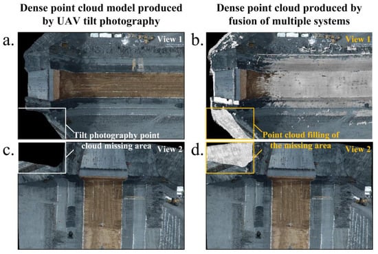 (a) Tilt photography point cloud under the top-down view along the dam axis; (b) fusion point cloud under the top-down view along the dam axis; (c) tilt photography point cloud under the 30-degree overhead view perpendicular to the dam axis; (d) fusion point cloud under the 30-degree overhead view perpendicular to the dam axis.