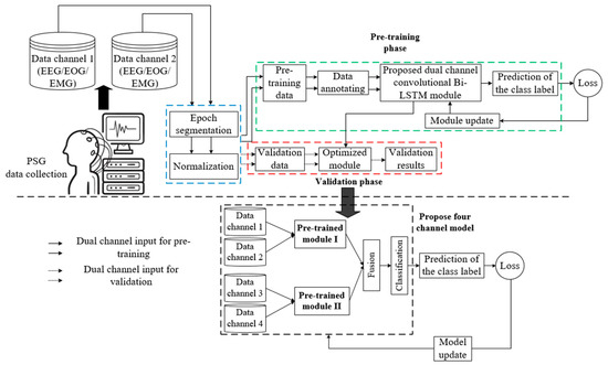 - In the proposed model, a dual-channel two-layer CNN-incorporated Bi-LSTM network module is designed and pre-trained utilizing data from any two distinct channel signals of the PSG recording.