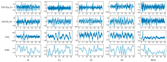Segmented epochs of five classes for the four channels (EEG Fpz-Cz, EEG Pz-Oz, EOG, and EMG) of the PSG signal.