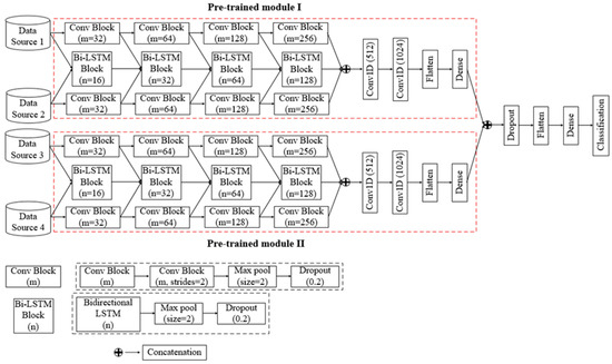 However, the building block of the dual-channel convolutional Bi-LSTM network is “Conv Block”, which consists of two consecutive 1D convolutional layers, a max pooling (Max pool) layer, and a dropout layer, as well as a “Bi-LSTM Block”, which consists of a bidirectional LSTM layer, a max pooling layer, and a dropout layer. Additionally, concatenation layers, a flatten layer, and a dense layer are also used in this proposed architecture.