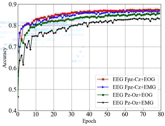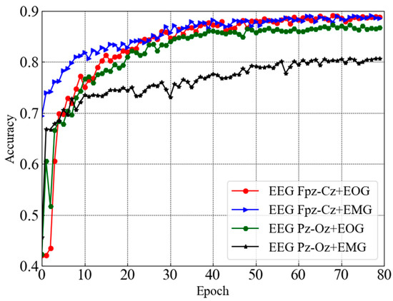 Figure 6 depicts the subsequent test accuracy (e.g., validation accuracy) for the dual-channel modules taking combinations of two distinct channels (e.g., EEG Fpz-Cz + EOG, EEG Fpz-Cz + EMG, EEG Pz-Oz + EOG, and EEG Pz-Oz + EMG) from the Sleep EDF-78 dataset. Similar to the above case, the convergence of the EEG Pz-Oz + EOG module is slow compared to the other modules. In the case of the Sleep EDF-78 dataset, the convergence rate of the EEG Fpz-Cz + EMG module is relatively higher than others.