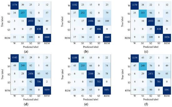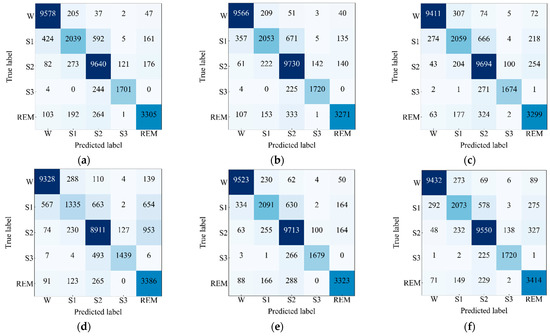 Confusion matrices of the proposed model for (a) EEG Fpz-Cz + EOG and EEG Fpz-Cz + EMG, (b) EEG Fpz-Cz + EOG and EEG Pz-Oz + EMG, (c) EEG Fpz-Cz + EMG and EEG Pz-Oz + EOG, (d) EEG Pz-Oz + EOG and EEG Pz-Oz + EMG, (e) EEG Fpz-Cz + EOG and EEG Pz-Oz + EOG, and (f) EEG Fpz-Cz + EMG and EEG Pz-Oz + EMG applied on Sleep EDF-20 dataset.